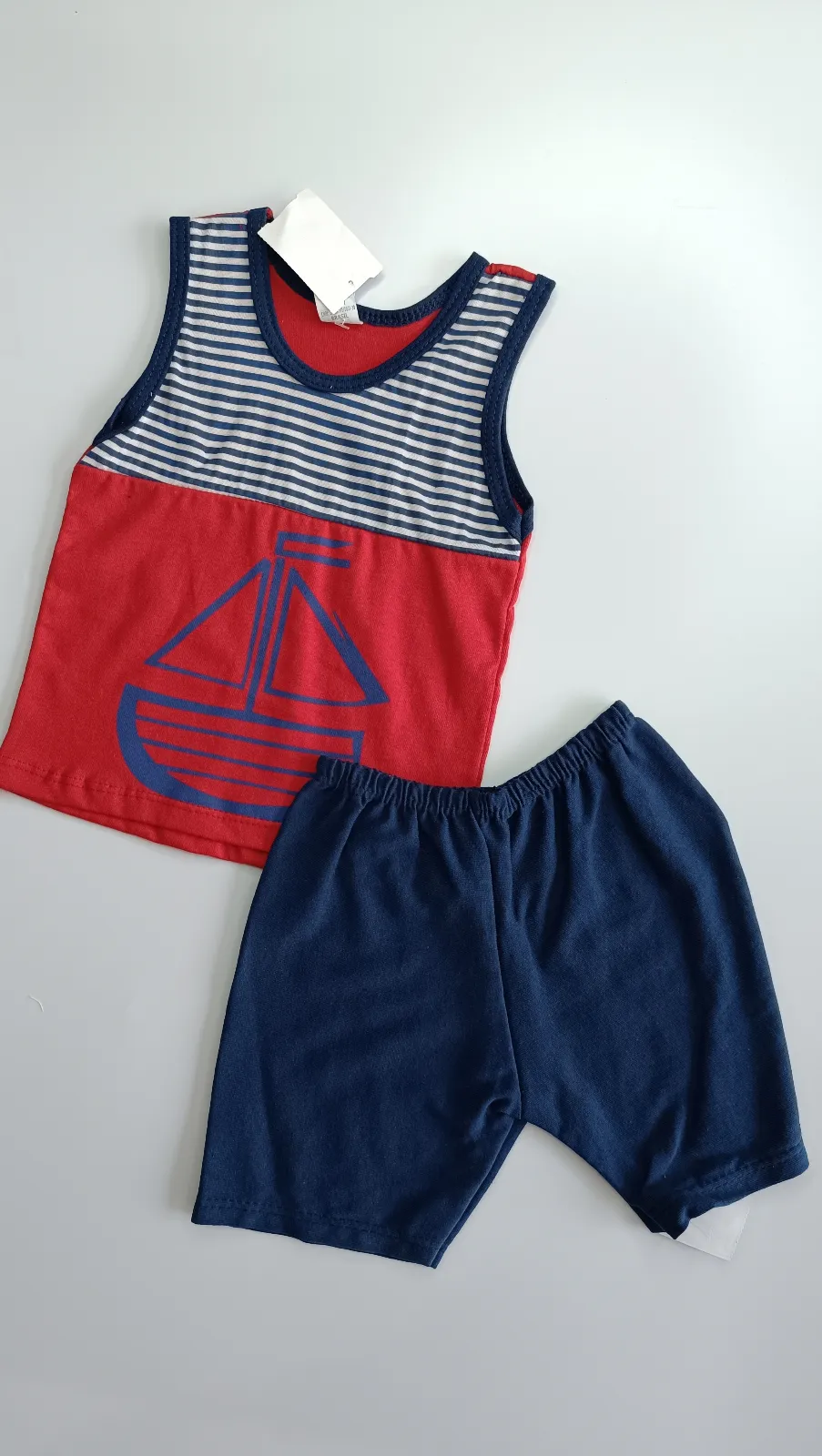RN menino - conj barco navegar regata vermelha detalhes listra e short azul 100% algodão-cod i 816